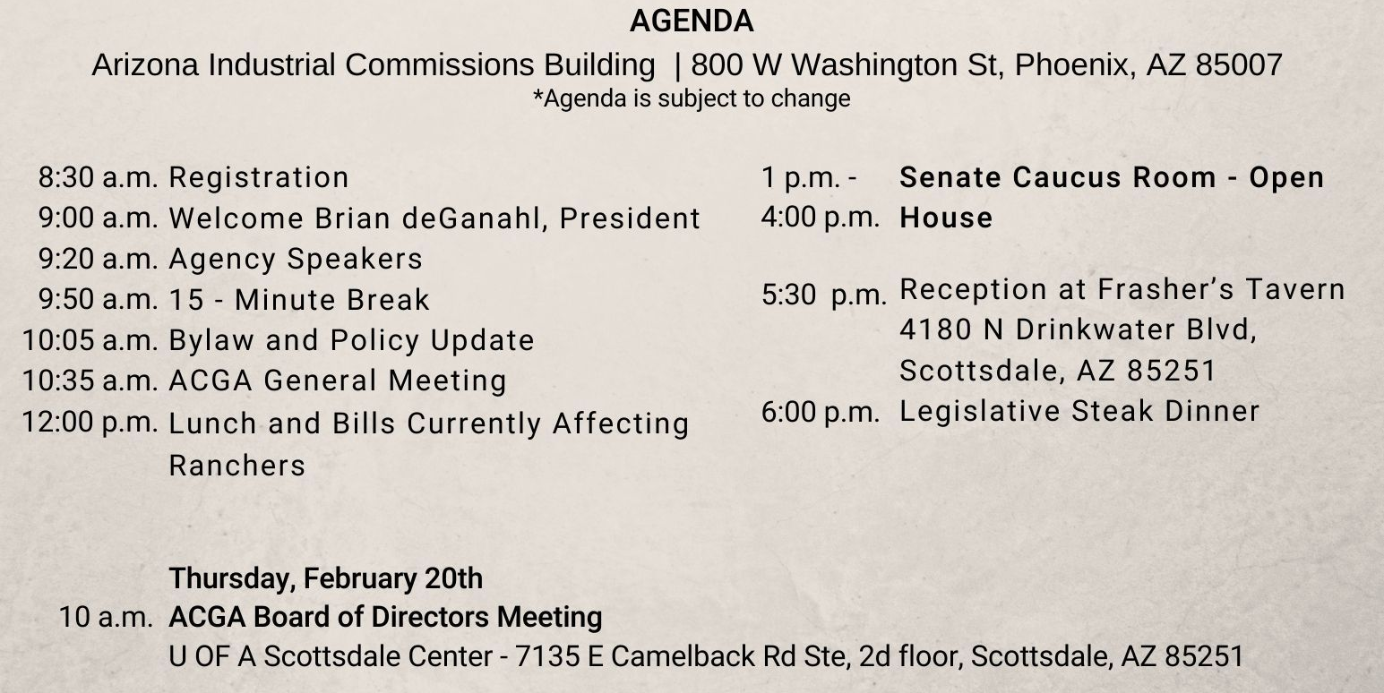 Join us for our Annual Legislative Winter Meeting! Gain valuable insights from state agency leaders, engage with legislative representatives from your county, network with fellow members, and help shape ACGA’s Bylaws and Policy. The event will conclude with the Legislative Dinner at Frasher's Tavern in Scottsdale, AZ. The following day, all members are encouraged to attend ACGA’s monthly board meeting at the University of Arizona Scottsdale Center.